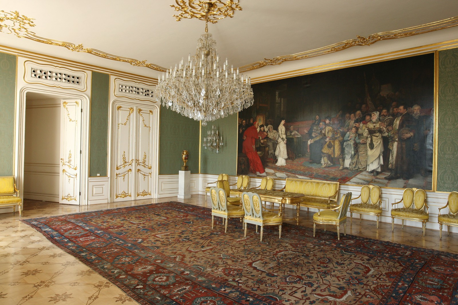 Při vstupu do Trůnního sálu nás upoutá ohromný vzácný koberec o rozměrech deset krát pět metrů. Je to jedna ze tří kopií perského originálu ze 16. století. Zde prezident republiky vykonává nástupní audience, a proto tento sál známe např. z televizního vysílání.